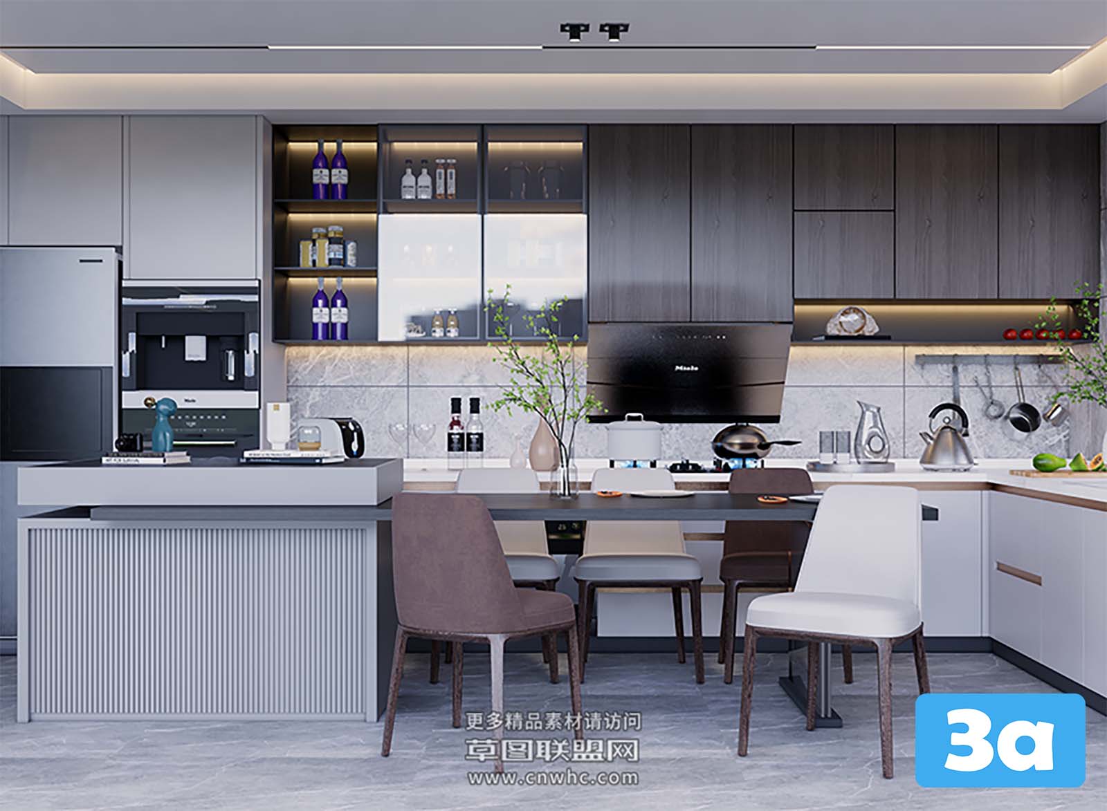 This 3D scene showcases a virtual reality dining room environment designed with modern aesthetics. The scene features a contemporary dining table, chairs, lighting fixtures, and decor elements. Experience the immersive nature of this VR space and explore the intricate details of the design.