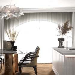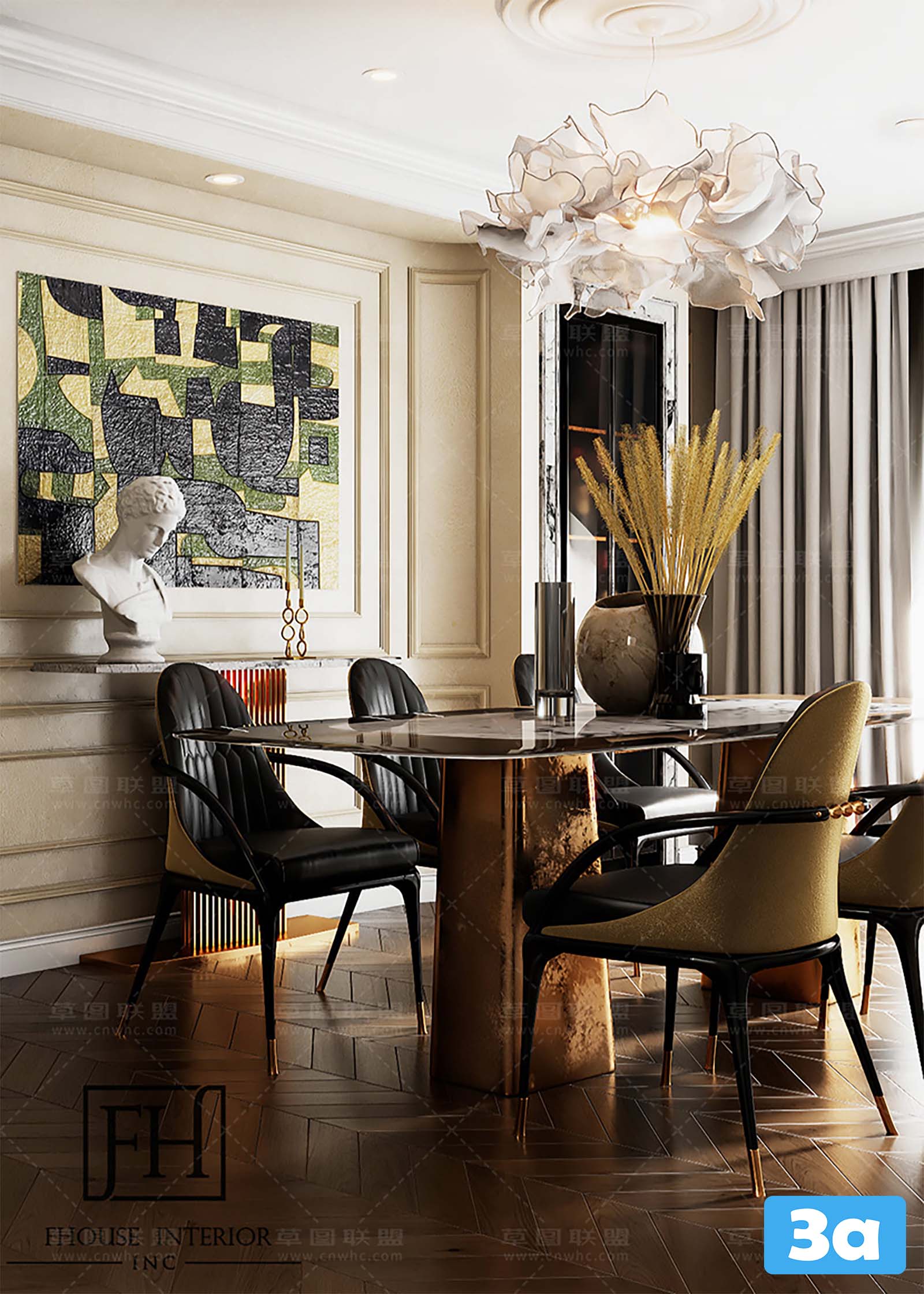 This 3D scene showcases a virtual reality dining room, providing a realistic and immersive experience. The modern interior design features stylish furniture and decor, creating a visually appealing space. Explore the details of this scene to get inspiration for your own interior design projects.