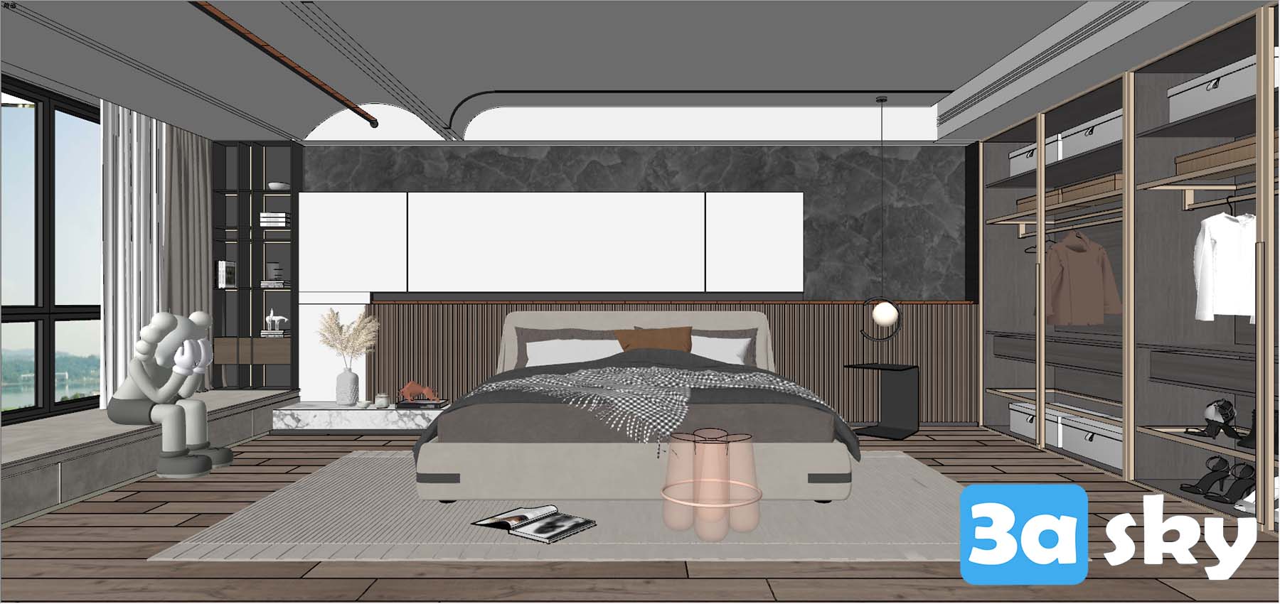 This 3D scene showcases a Wabi-Sabi inspired bedroom design, characterized by its simplicity, minimalism, and focus on natural elements. The room exudes a sense of tranquility and calmness, embracing imperfection and impermanence as part of its aesthetic. The design features a harmonious blend of textures, earthy tones, and organic materials, creating a serene and inviting space for relaxation and contemplation.