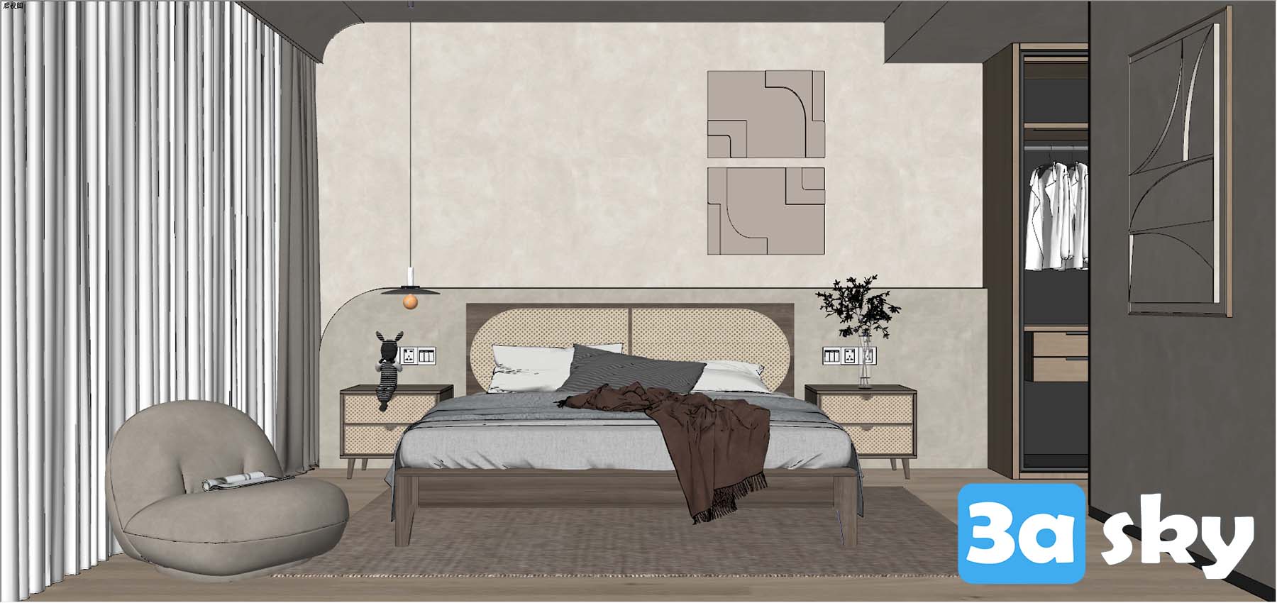 This 3D scene showcases a Wabi-Sabi inspired bedroom design, characterized by its simplicity, minimalism, and focus on natural elements. The room exudes a sense of tranquility and calmness, embracing imperfection and impermanence as part of its aesthetic. The blend of textures, earthy tones, and thoughtful placement of furniture creates a harmonious and peaceful space for relaxation and contemplation.