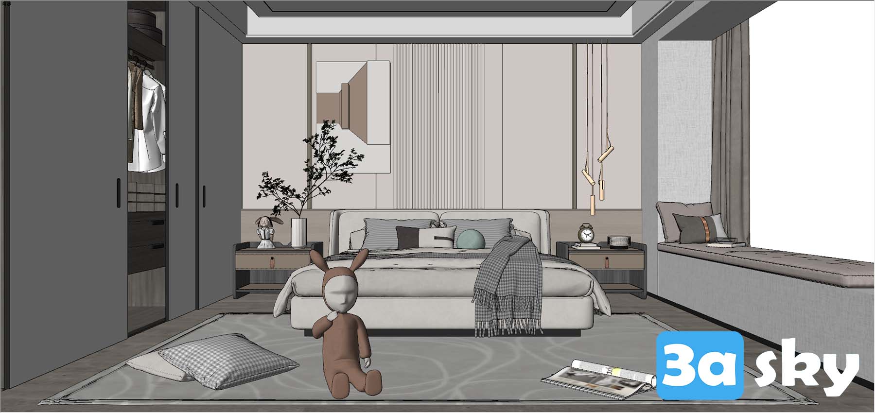 This 3D scene showcases a Wabi-Sabi bedroom design, characterized by its tranquil and minimalistic approach. The room features natural elements, imperfections, and a sense of simplicity that embodies the essence of Wabi-Sabi aesthetics. Explore the beauty of imperfection and serenity in this minimalist bedroom setting.
