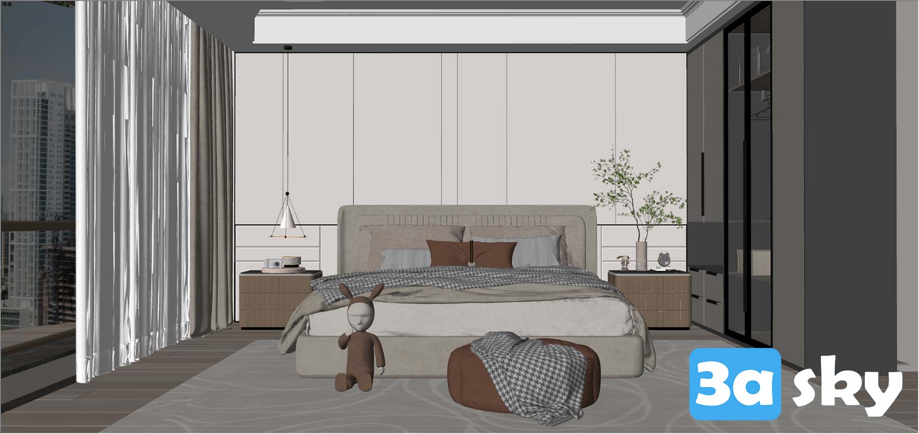 This 3D scene showcases a Wabi-Sabi inspired bedroom design. The concept of Wabi-Sabi celebrates imperfection, simplicity, and the beauty of natural materials. The room exudes a serene and calming atmosphere, with minimalistic furniture and earthy tones. Embrace the essence of Wabi-Sabi in this beautifully designed bedroom space.