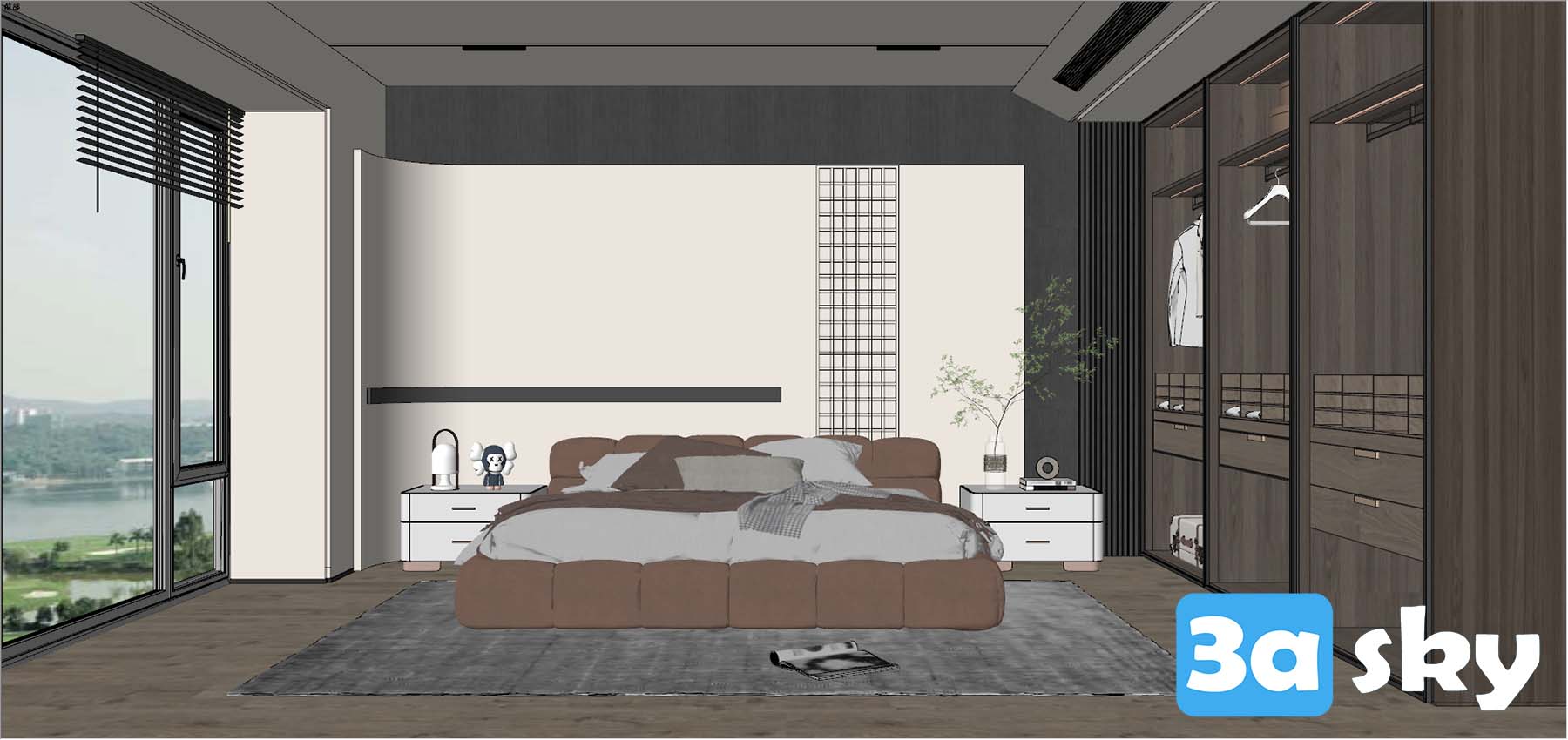 This Sketchup/3D scene showcases a Wabi-Sabi inspired bedroom design. The room exudes tranquility and minimalism, with a focus on natural elements and imperfection. The design embraces simplicity and the beauty of imperfection, creating a serene and peaceful atmosphere.