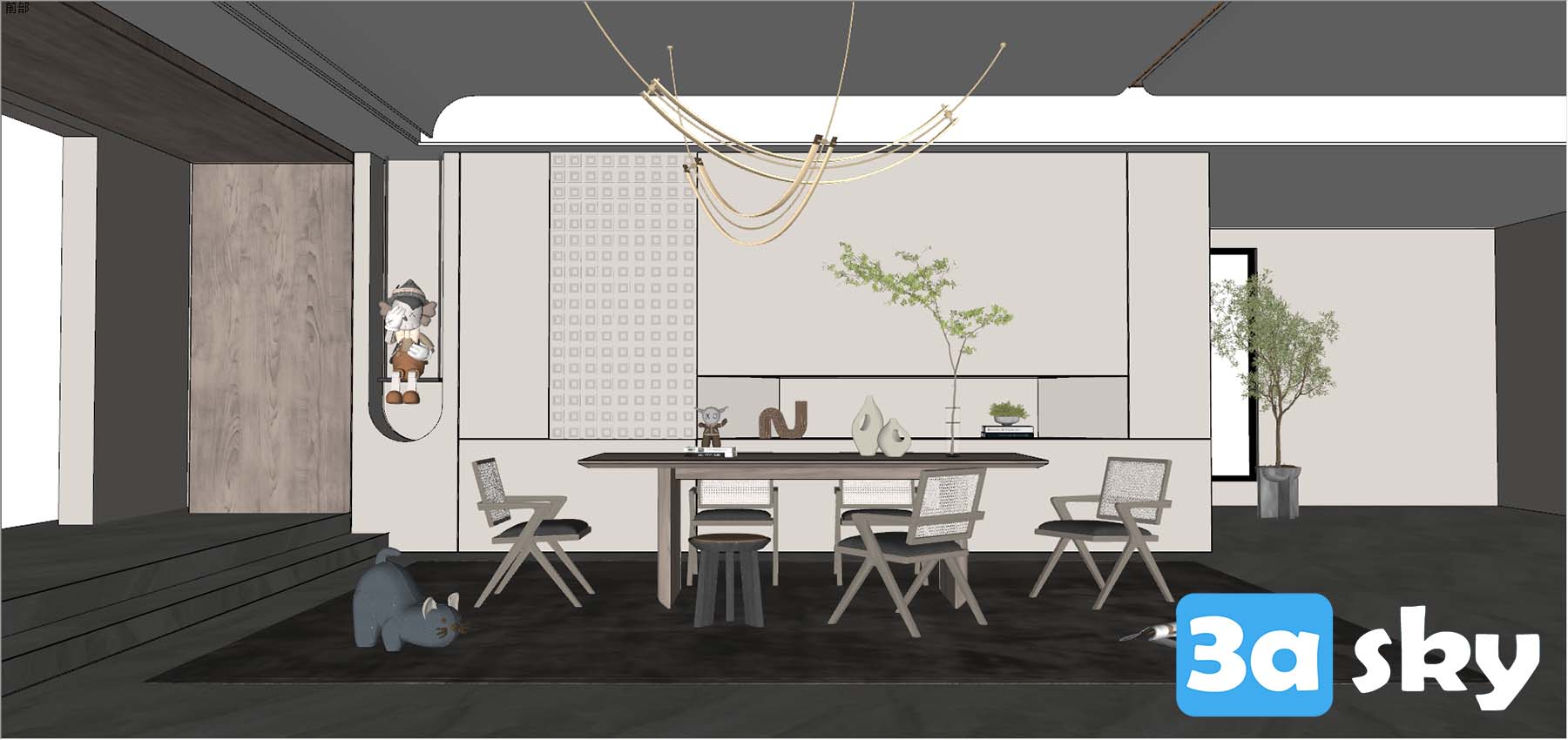 This 3D scene features a Wabi-Sabi dining room, inspired by Japanese design principles. The room exudes tranquility with its minimalist decor, natural materials, and subtle imperfections. Embracing the beauty of impermanence and simplicity, the Wabi-Sabi aesthetic creates a harmonious and peaceful space for dining and relaxation.