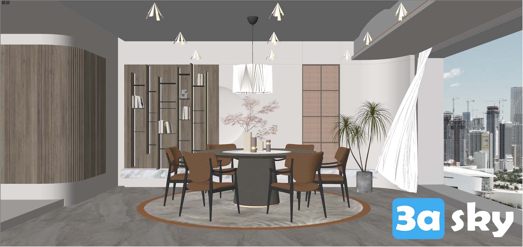 This 3D scene features a Wabi-Sabi inspired dining room, embodying the essence of Japanese aesthetics. The design focuses on simplicity, imperfection, and the beauty of natural materials. The space exudes a serene and minimalist vibe, perfect for those who appreciate the art of understated elegance.