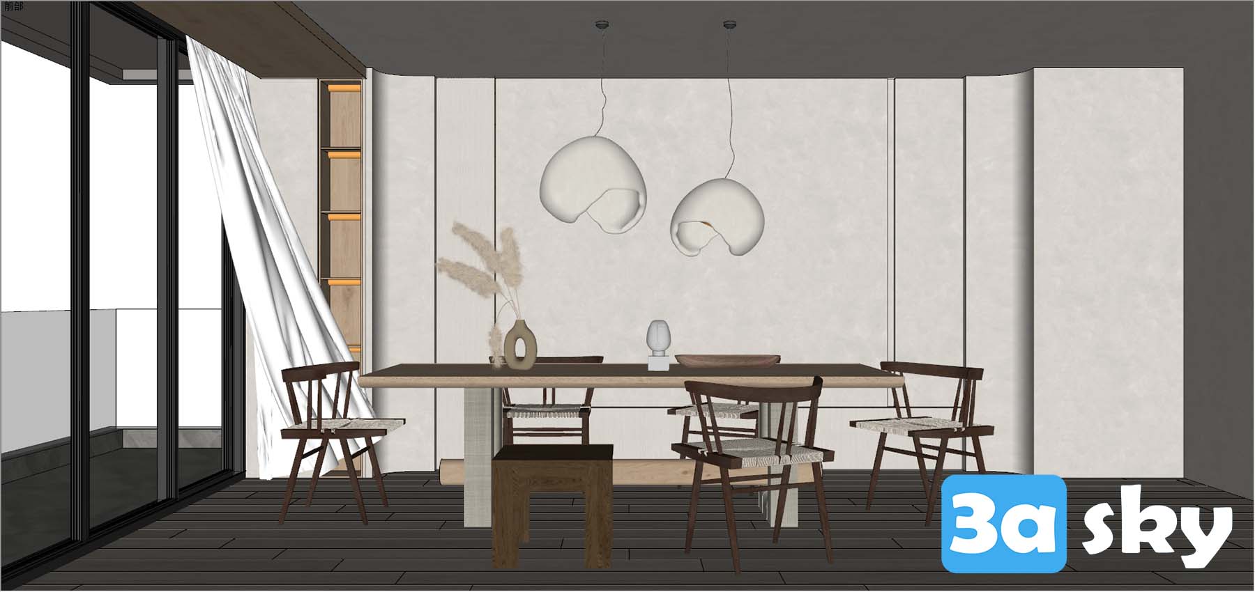 This 3D scene features a Wabi-Sabi inspired dining room, embodying the essence of the Japanese aesthetic philosophy. The design focuses on embracing imperfection, simplicity, and the beauty of natural materials. The space exudes a sense of tranquility and harmony, inviting viewers to appreciate the elegance in simplicity.