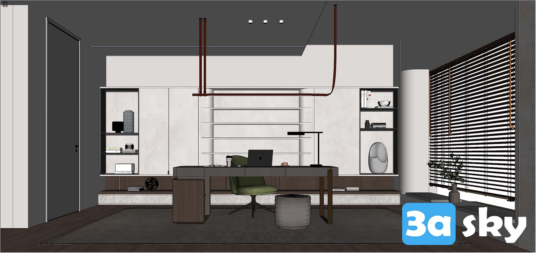 This 3D scene showcases a Wabi-Sabi inspired workspace, characterized by its minimalistic design and tranquil ambiance. The space exudes simplicity and elegance, perfect for those who appreciate a serene and uncluttered environment. The subtle details and natural elements create a harmonious and calming atmosphere, ideal for focused work or relaxation.