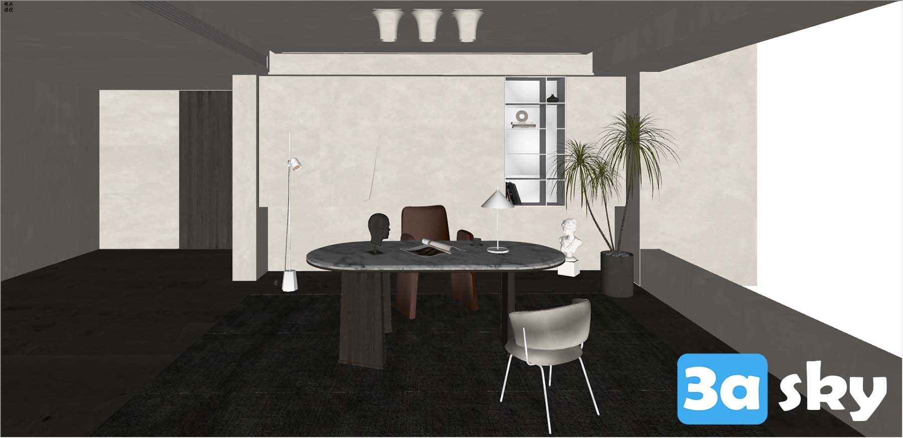 This 3D scene showcases a Wabi-Sabi inspired workspace, characterized by its minimalistic design and tranquil ambiance. The space exudes simplicity and elegance, perfect for those who appreciate the beauty of imperfection and impermanence. The blend of natural elements and modern aesthetics creates a harmonious environment for work and contemplation.