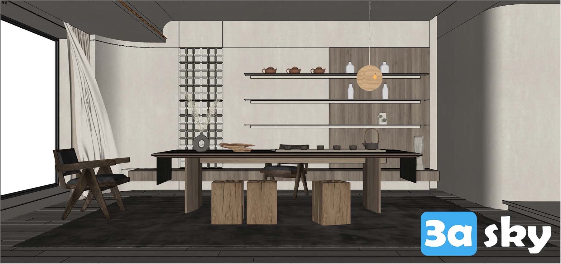 This 3D scene showcases a Wabi-Sabi inspired workspace, characterized by its minimalistic design and tranquil ambiance. The space exudes simplicity and elegance, perfect for those who appreciate the beauty of imperfection and impermanence. The blend of natural elements and modern aesthetics creates a harmonious environment for work and contemplation.