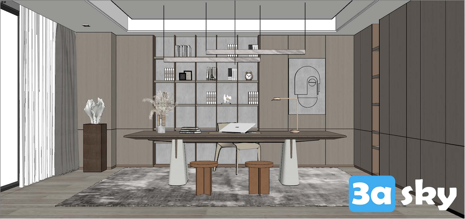 This 3D scene showcases a Wabi-Sabi inspired workspace design, emphasizing simplicity, imperfection, and a serene atmosphere. The design features minimalist elements and a calming color palette, creating a tranquil and harmonious work environment.
