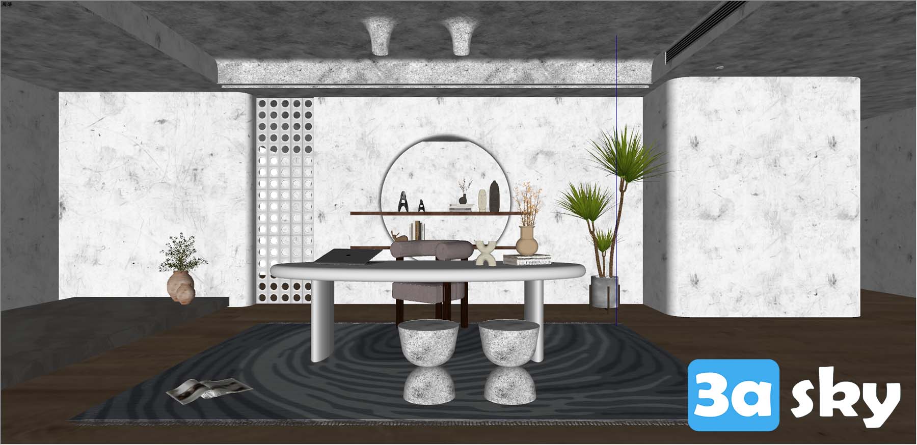 This 3D scene showcases a Wabi-Sabi inspired workspace design, emphasizing simplicity, imperfection, and a serene atmosphere. The design features minimalist elements, natural textures, and a calming color palette. Experience the beauty of Wabi-Sabi philosophy in this tranquil workspace setting.