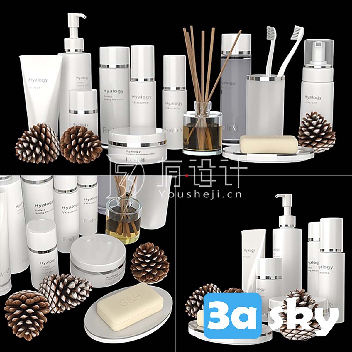 This 3D model showcases a set of white cosmetics suitable for bathroom and WC environments. The design is sleek and modern, making it ideal for interior design projects. The set includes various items such as bottles, jars, and containers, all in a clean white color scheme. Enhance your virtual spaces with this realistic and detailed 3D model.