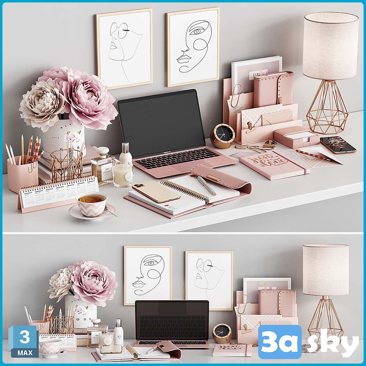 This 3D model showcases a workplace set with a rose decoration theme. It is designed for interior design and decoration projects. The file is in 3DS MAX format, providing high-quality details for realistic visualization. Enhance your design projects with this elegant and stylish workplace set.
