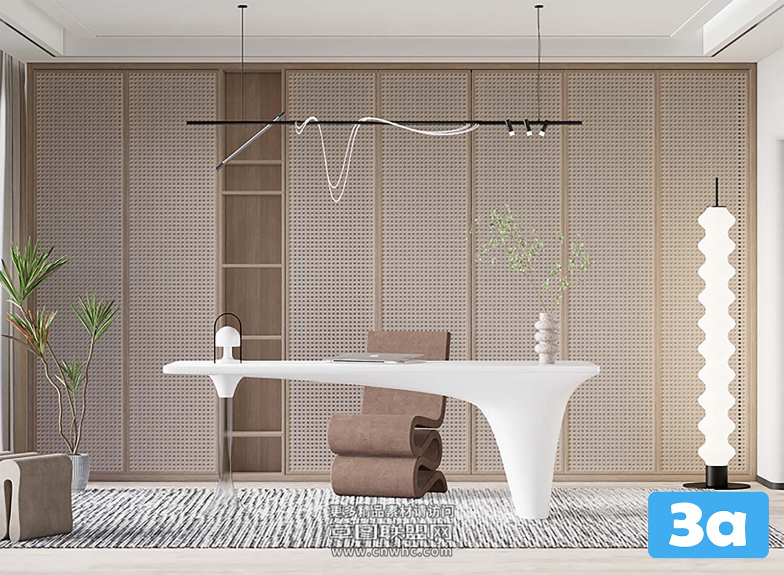 This 3D scene showcases a modern workroom setup with a desk, chair, computer, and plants. It is designed in SketchUp, perfect for interior design enthusiasts and creative professionals looking for inspiration.