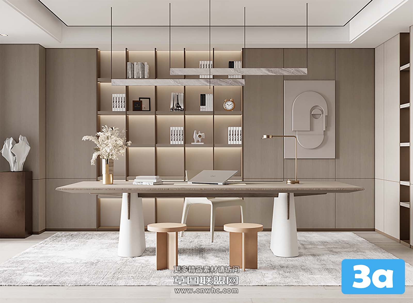 This 3D scene showcases a modern workroom setup with a desk, chair, computer, lamp, plant, and a window. The design is sleek and contemporary, perfect for interior design enthusiasts and professionals. Created using SketchUp software, this model offers inspiration for workspace design and visualization projects.