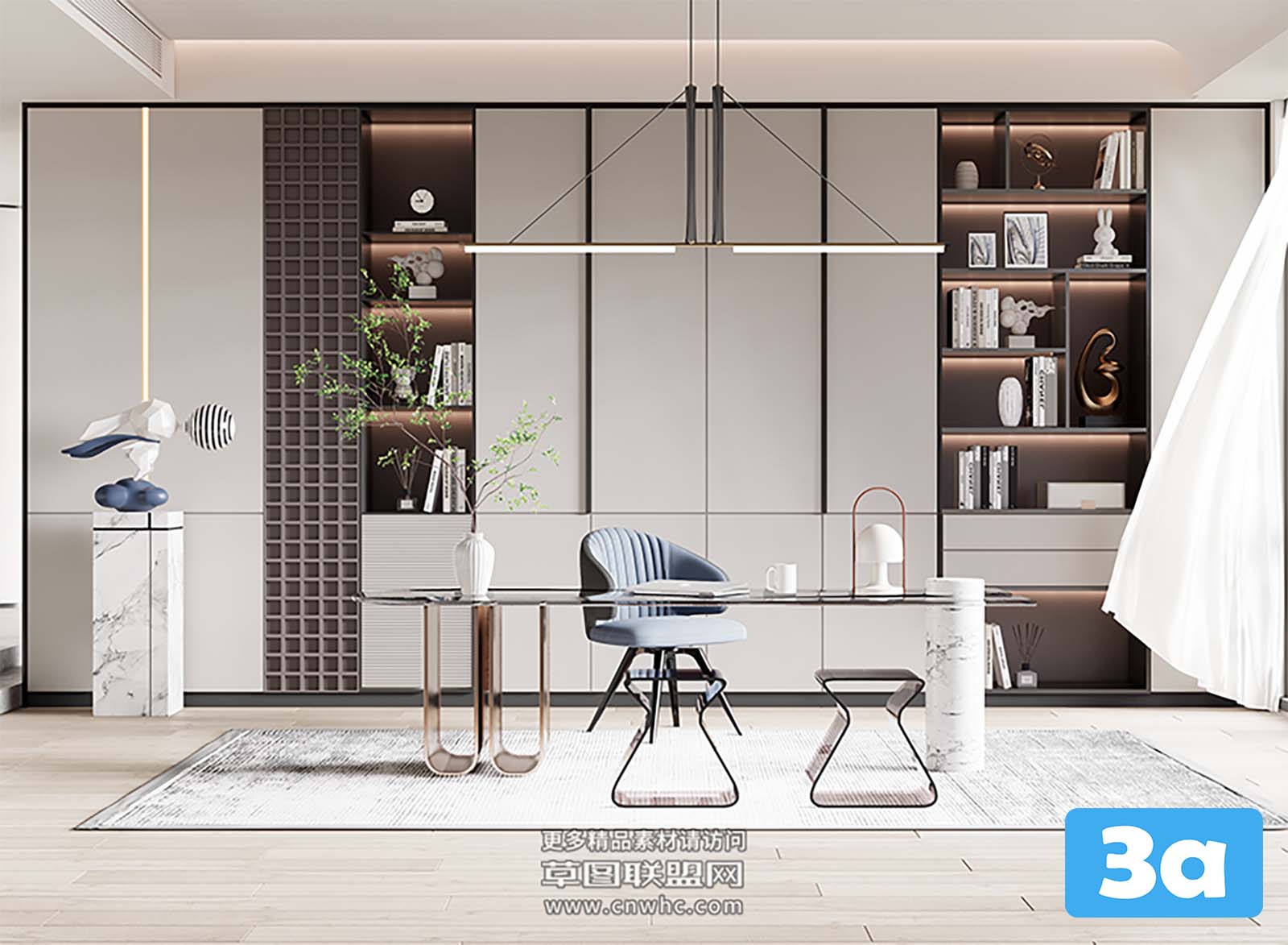 This 3D scene showcases a modern workroom setup with a desk, chair, computer, and plants. The interior design is created in SketchUp, providing a realistic and detailed visualization of a workspace.