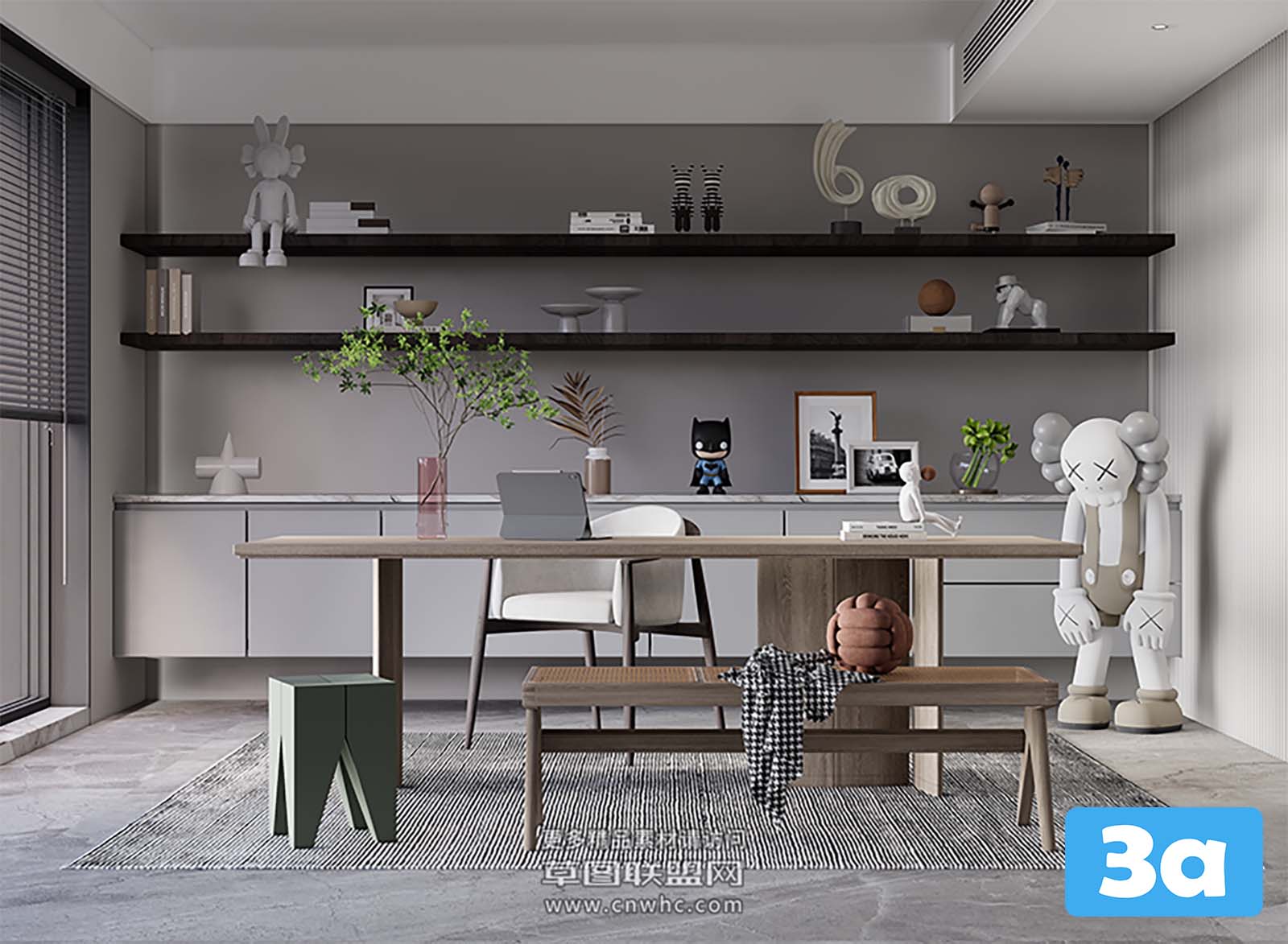 This 3D scene showcases a well-designed workroom interior created in Sketchup. The scene features a modern workspace layout with stylish furniture and decor. Explore the design elements and get inspired for your own interior projects.