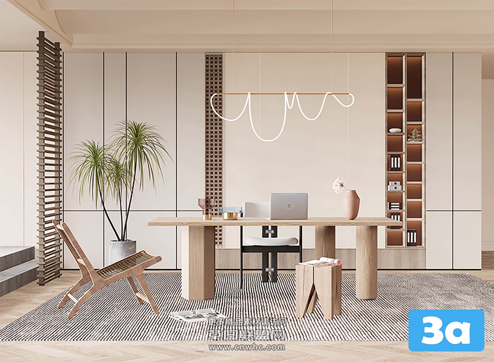 This 3D scene showcases a modern workroom setup with a desk, chair, computer, and plants. The design is created in SketchUp, providing a detailed and realistic representation of a stylish workspace.