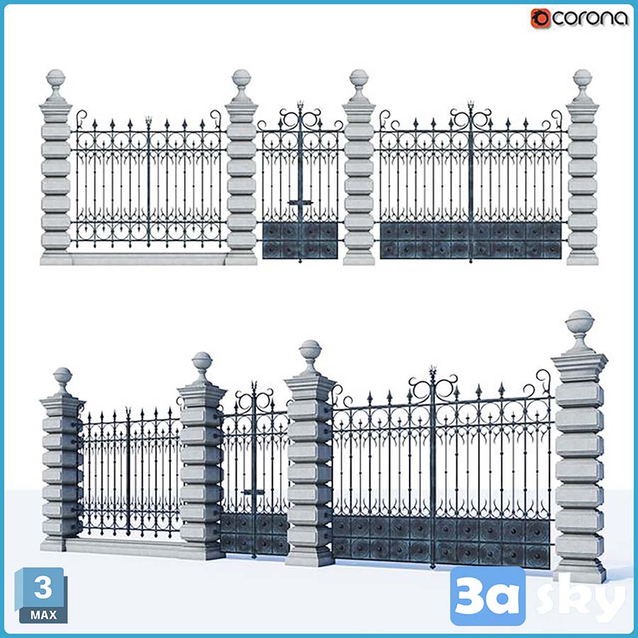 This 3D model features a beautifully crafted wrought iron fence, suitable for architectural projects requiring a touch of elegance and security. The intricate design and attention to detail make it a perfect addition to any outdoor scene. Download this high-quality 3D model now and enhance your architectural visualizations.